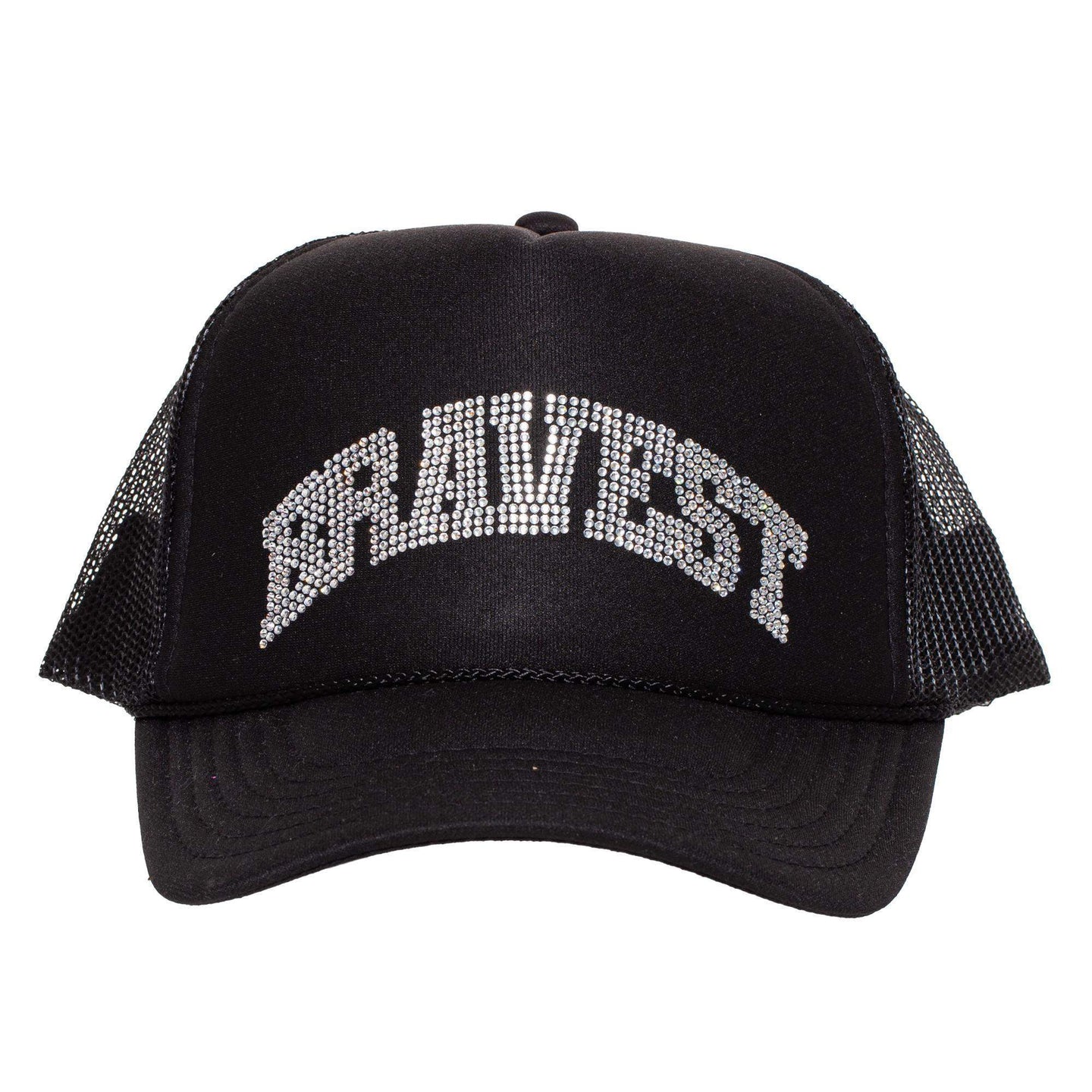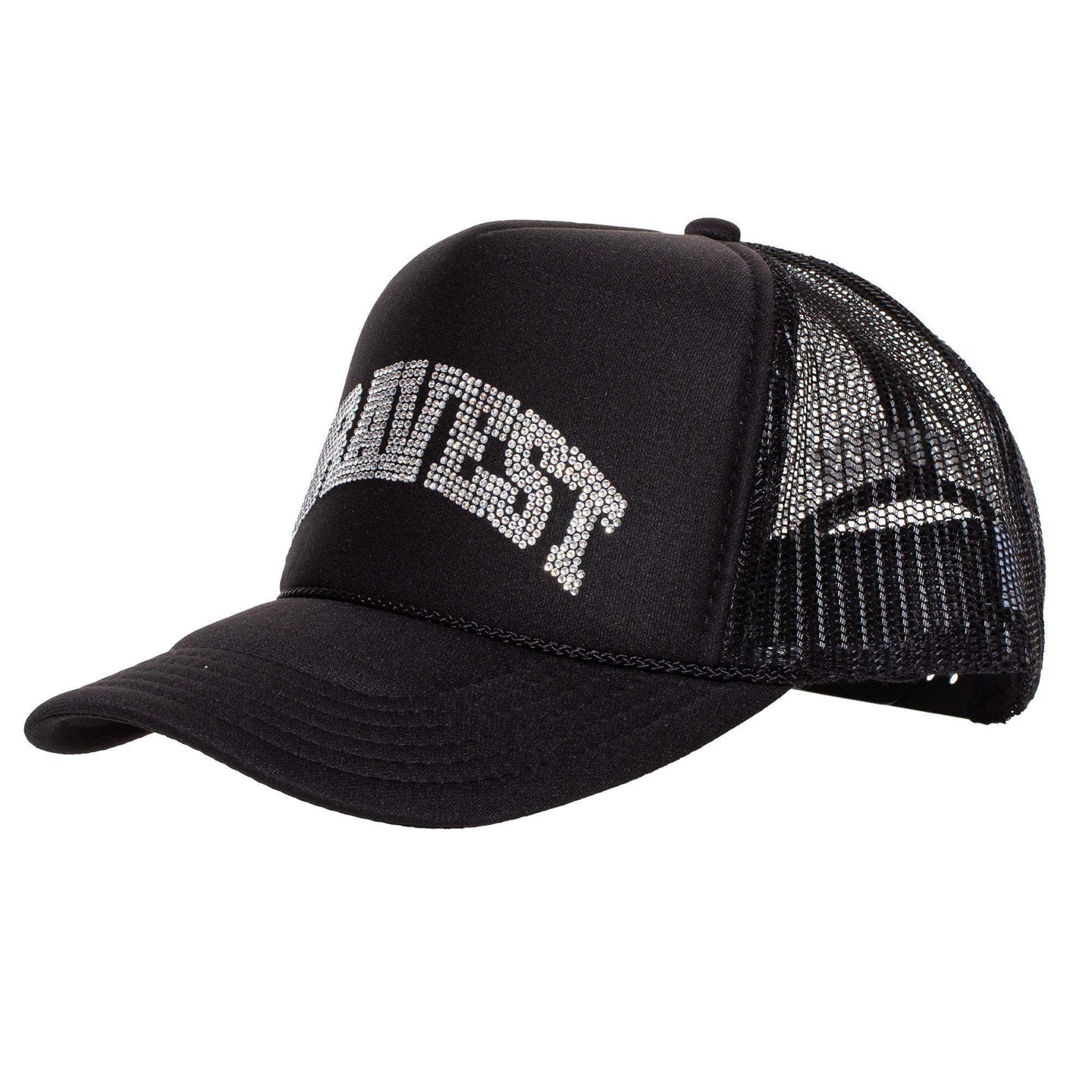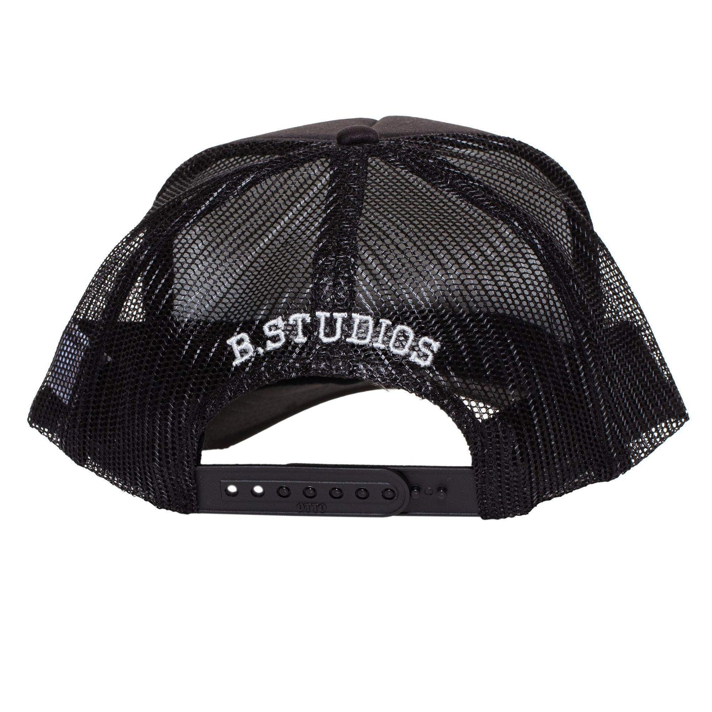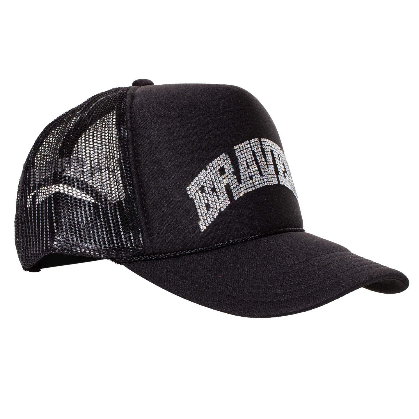 Black classic style trucker cap with rhinestone crystal BRAVEST on the front. B. Studios emroidered on mesh above the adjustable strap on the backside.