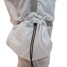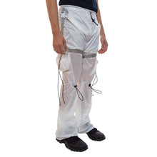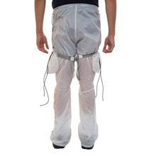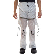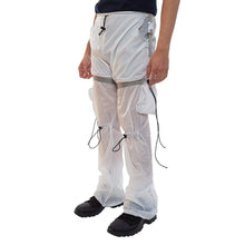 Handmade nylon pants with adjustable drawstrings at the knee, two front pockets, removable cargo pockets with adjustable strap, and drawstring closure on the pockets.