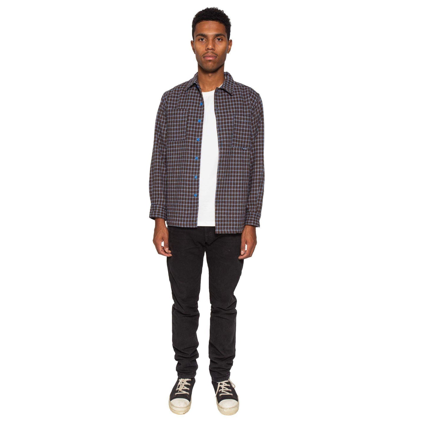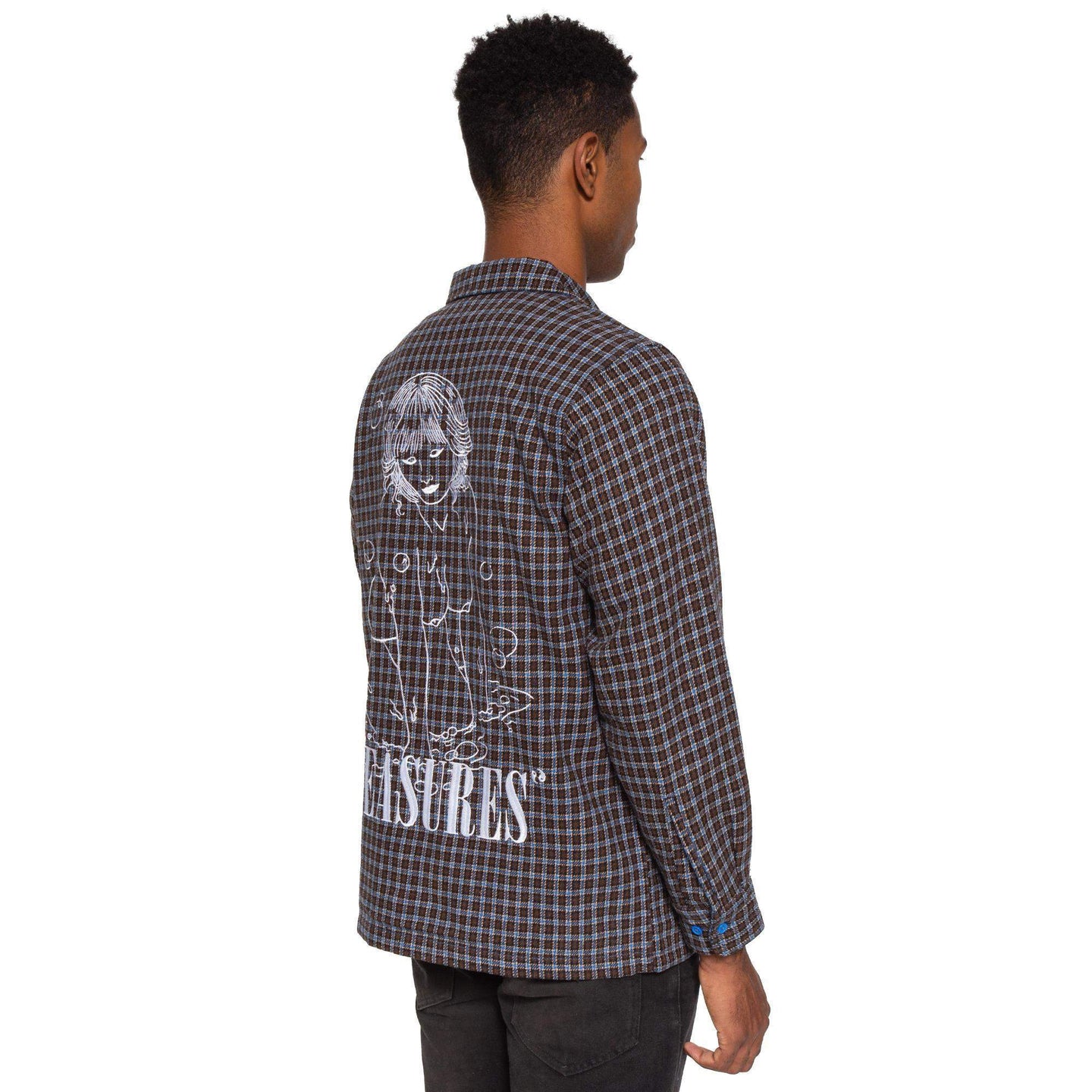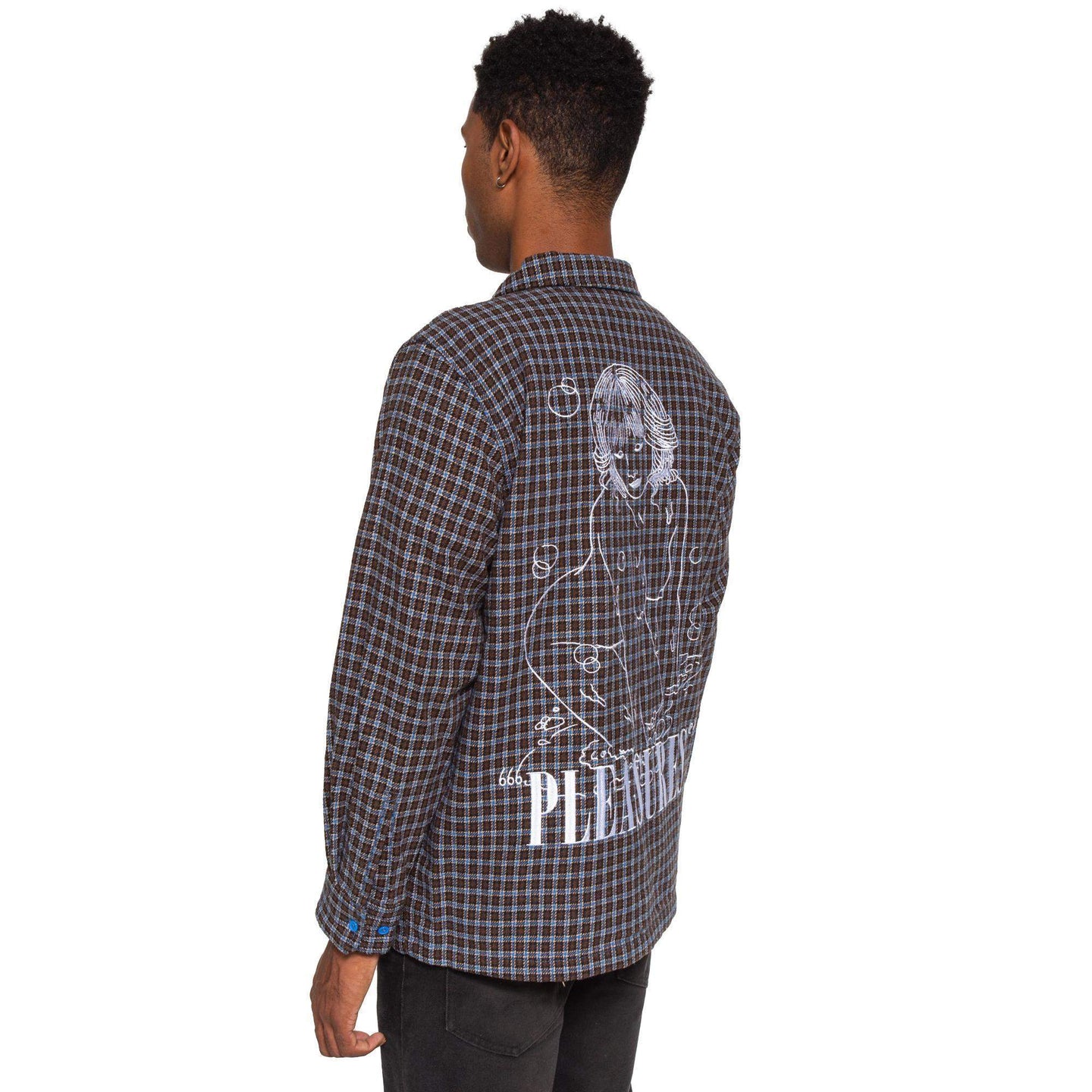 Brownie points ! Premium heavy weight cotton Plaid button down. Two large pockets on chest. Embroidered graphic on back by artist Alexander Stewart.