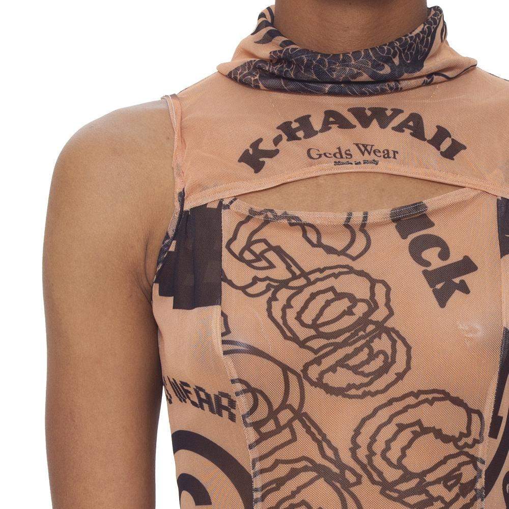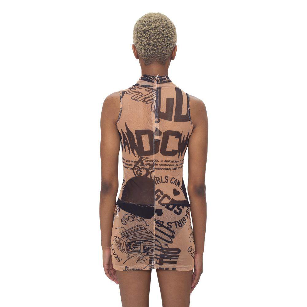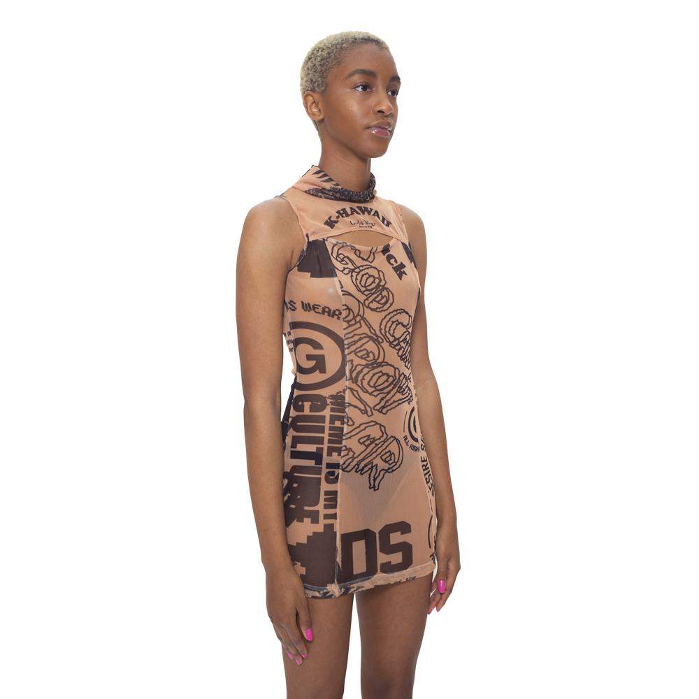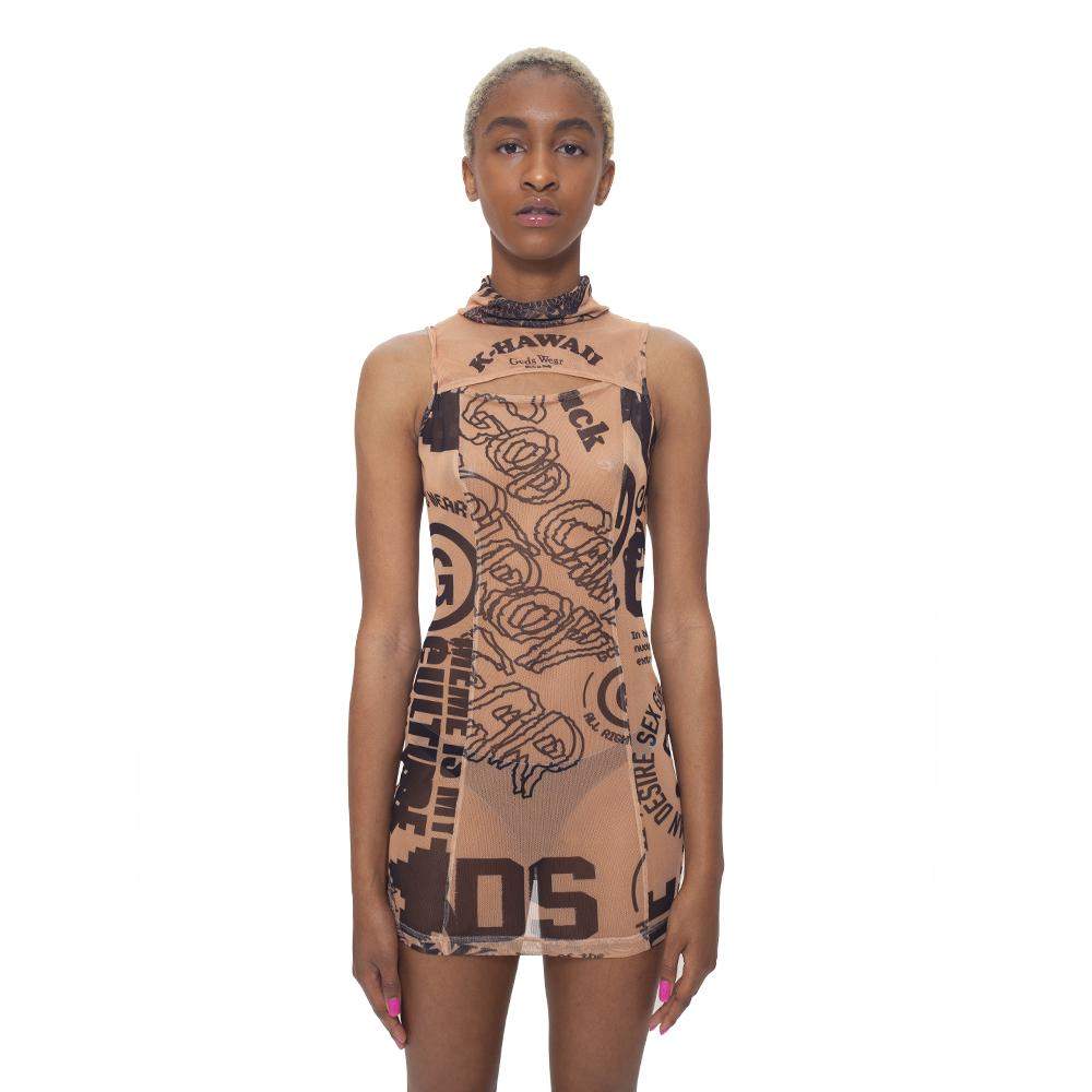 Beige mesh see through skin colored dress with GCDS mix logos. Tight fit.