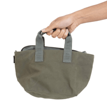 Canvas tote in khaki green. Twin carry handles at top. Logo flag at side. Zip closure. Patch pockets and logo patch at interior. Partial twill lining. Tonal hardware. Approx. 13" length x 6.5" height x 5" width.