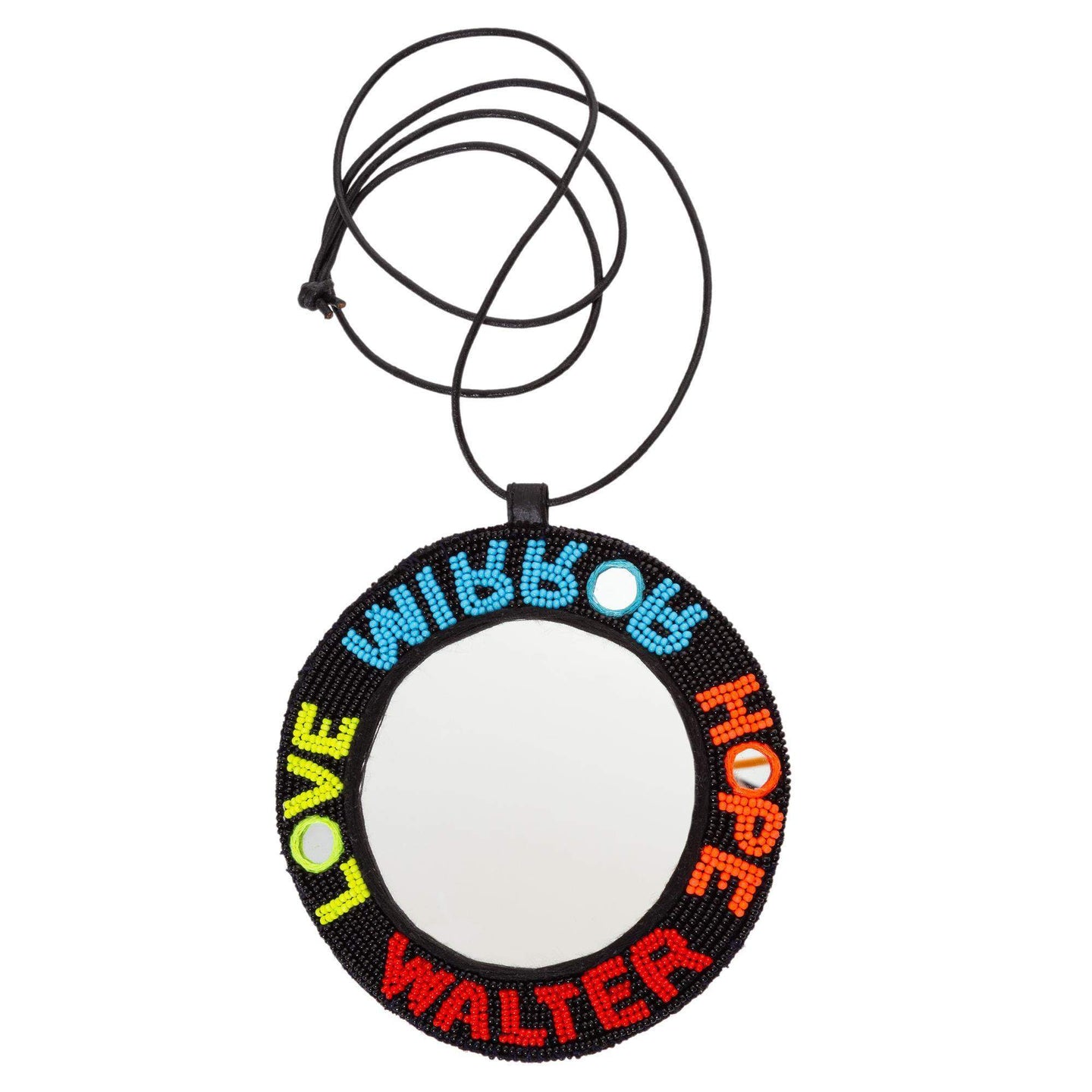 Walter Van Beirendonck Mirror-Mirror necklacke! A hand beaded circular mirror, the border reads "LOVE MIRROR WALTER HOPE"