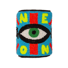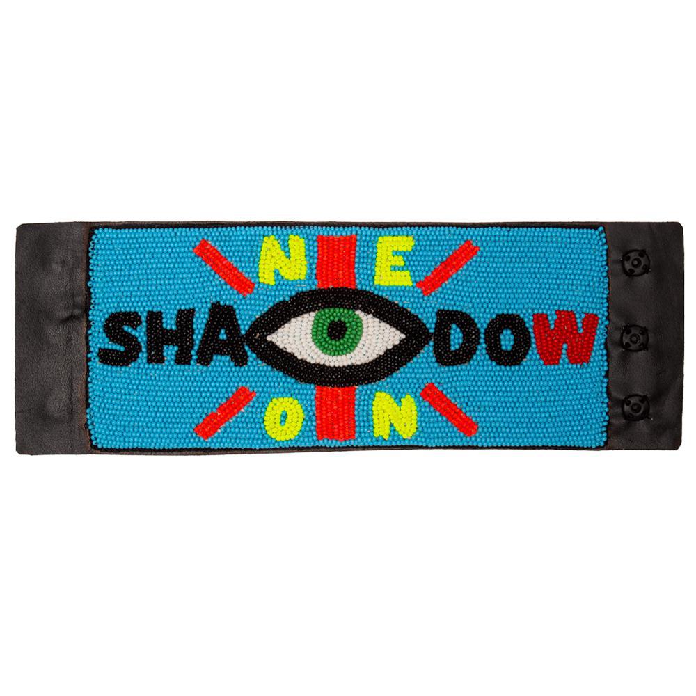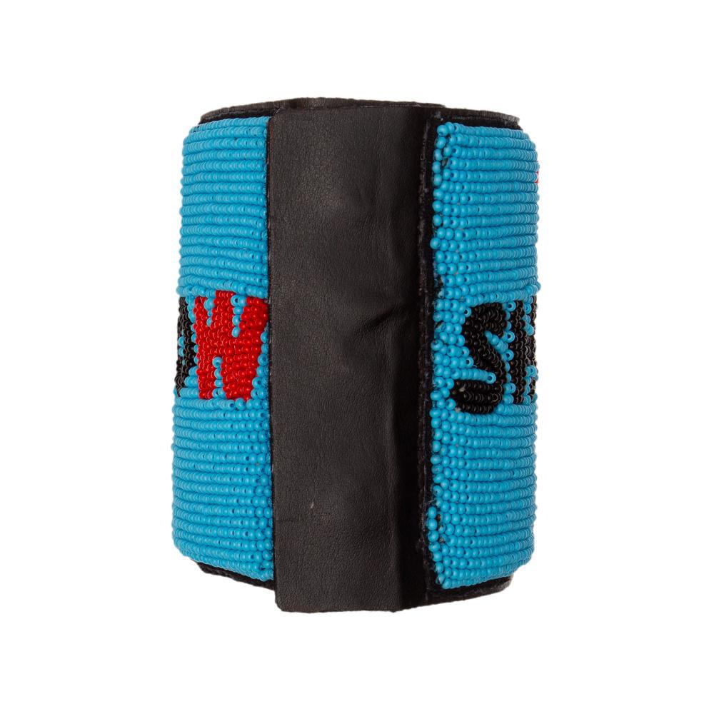 Wide leather bracelet with multicolored beading producing collection title, “Neon Shadow,” and collection recurring eyeball. Thick layers of beads with vibrant red, yellow, and green on a blue background create a disgustingly delightful clash of colors. Adding to the long line of iconic jewelry by Walter Van Beirendonck.