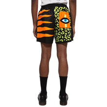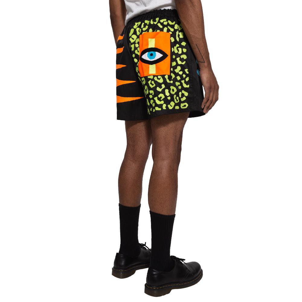Collection title “Neon Shadow” in bright colors across front of a boxing style short. Tiger, leopard, and eyeball graphics on back as well as lightning bolt graphics on front allude to other pieces within the collection. Large back pocket will not only help you keep your things, but watch your back for you as well.