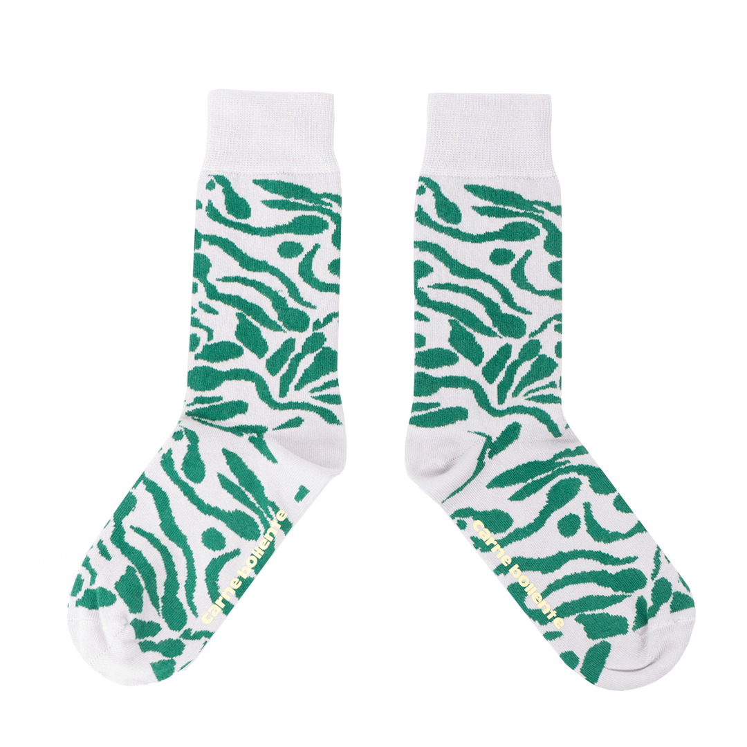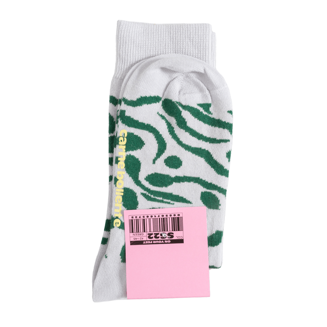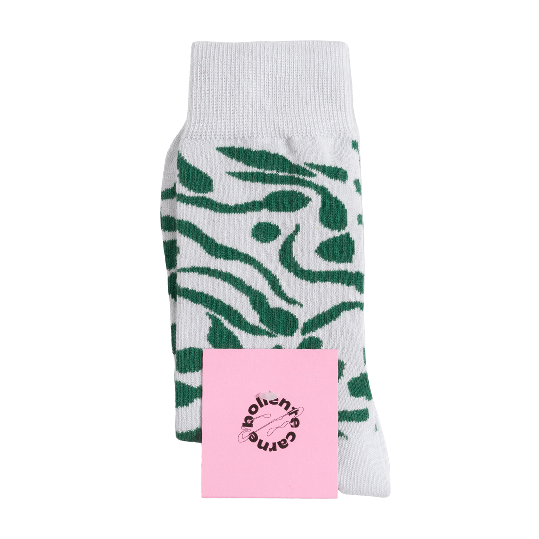 From Carne Bollente Spring/Summer 22. White socks with green all over "jizz" print. Carne Bollente logo on bottom of foot.