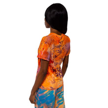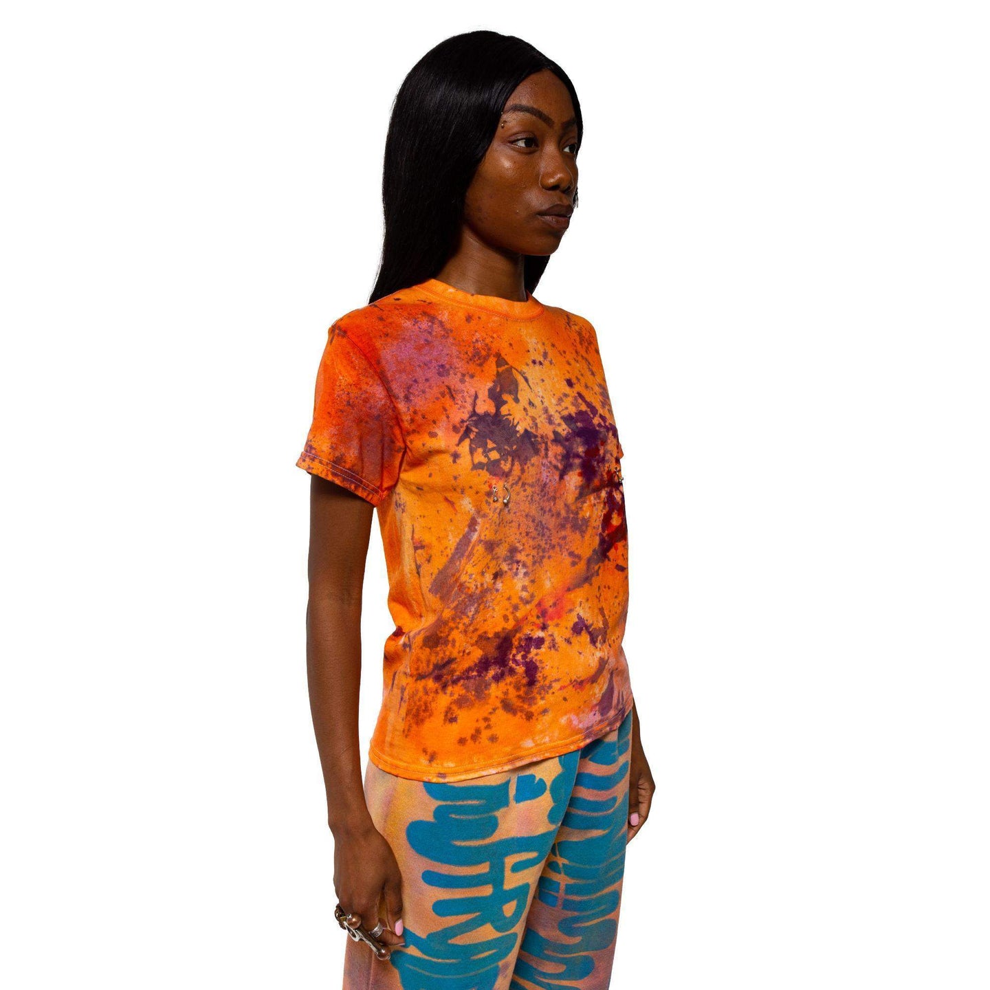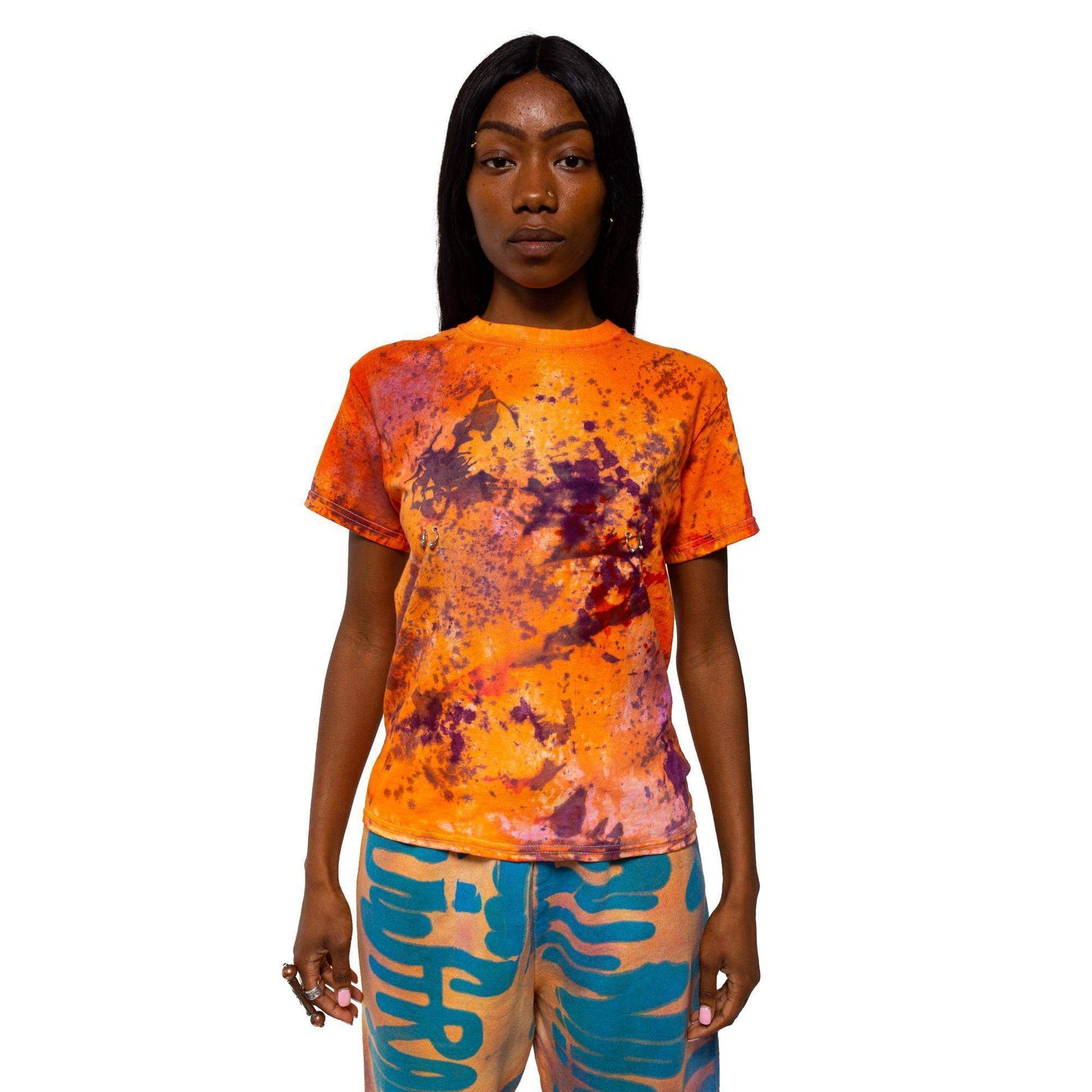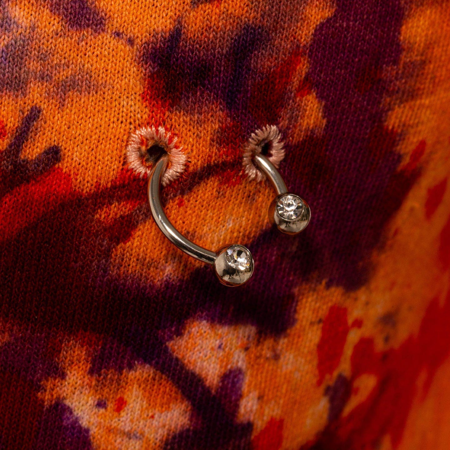 Hand dyed cotton t-shirt. Jeweled nipple piercing details affixed at the chest.
