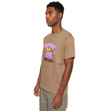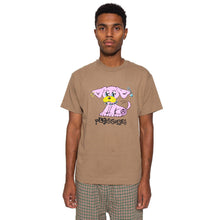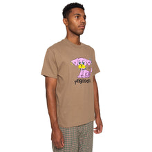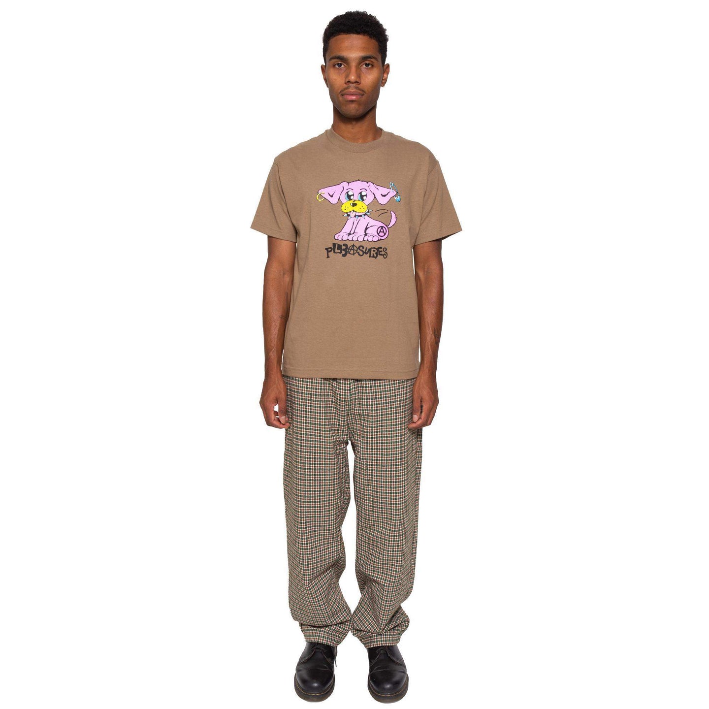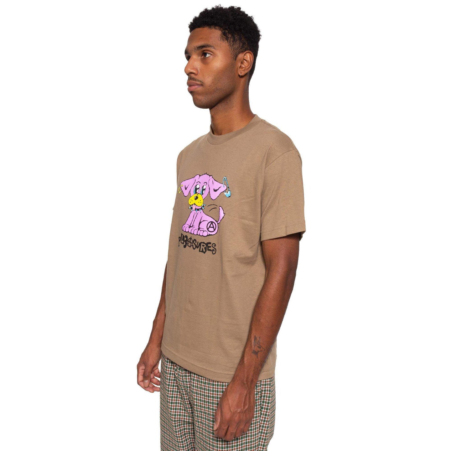 Safari Green / Brown cotton t-shirt with a bright screen printed graphic featuring a piereced up pink punk rock puppy with an anarchy inspired Pleasures logo. Pleasures punk pup!
