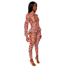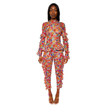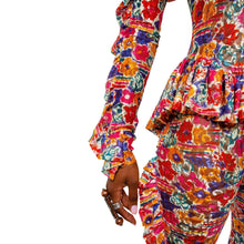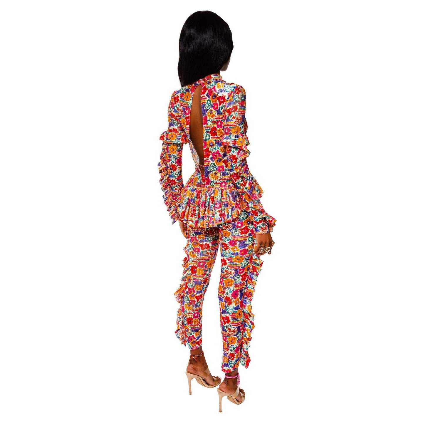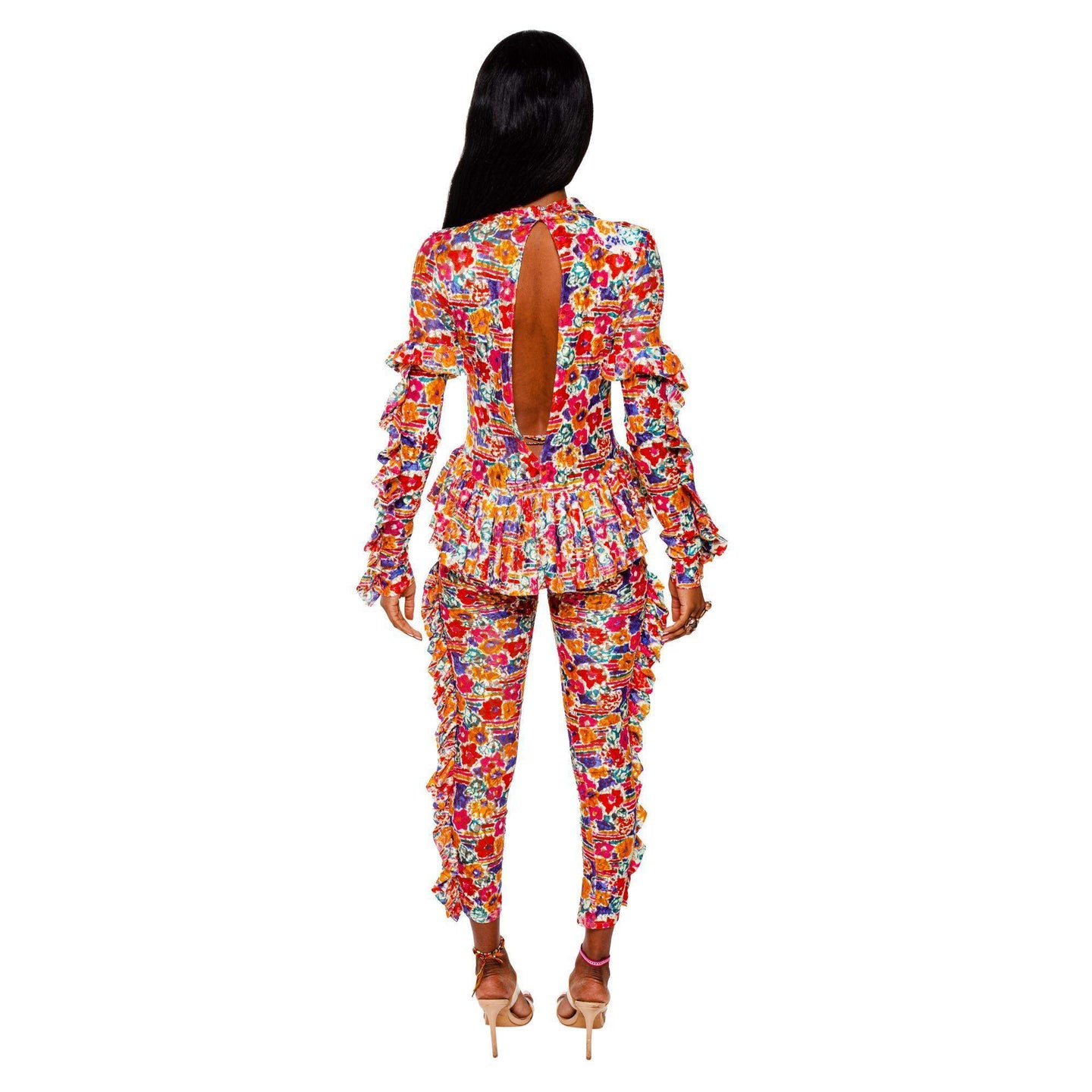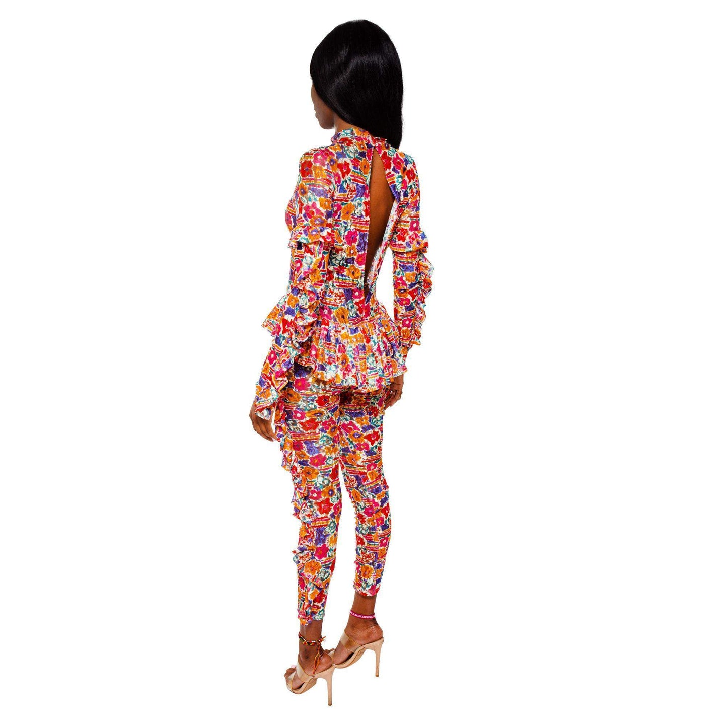 Long sleeve semi-sheer stretch lace bodysuit featuring floral pattern in multicolor. Ruffled trim throughout. Mock neck collar. Keyhole opening with button closure at back collar. Open back. Slim-fit. Unlined.