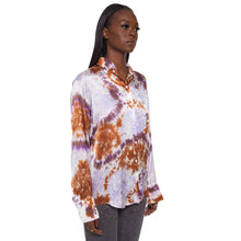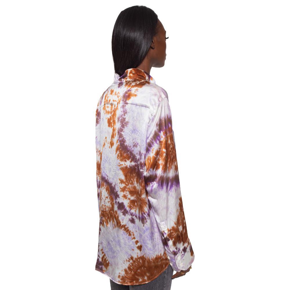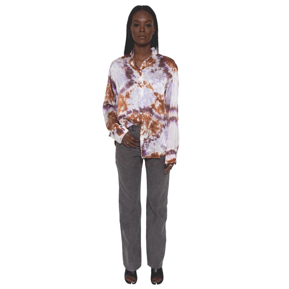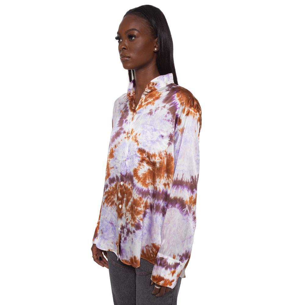 From LĒO Spring/Summer '22 collection 'Aura.' A unisex hand silk button up shirt with round collar and curved hemline. Satin textured white shirt with  light purple, dark with dark purple and sepia hand tie-dyed details.