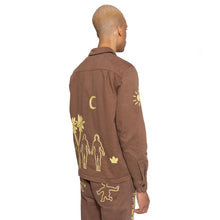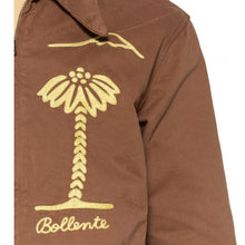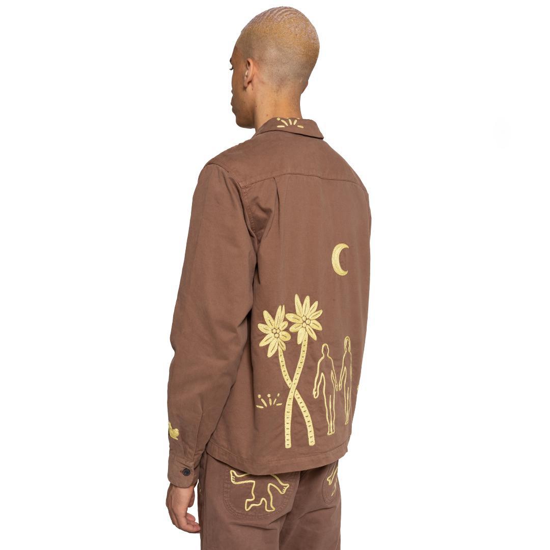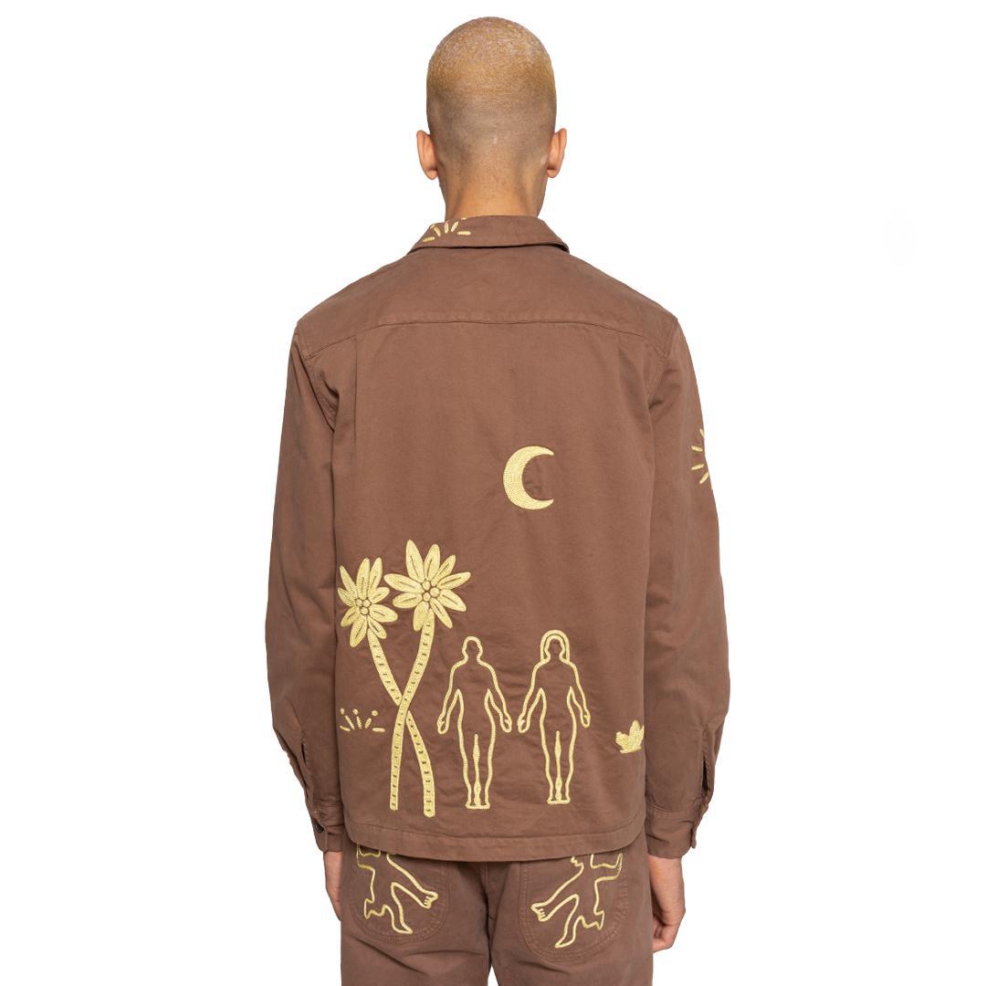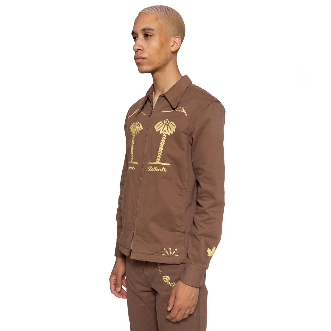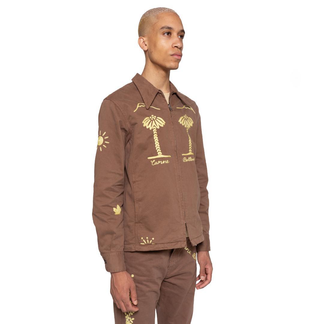 From Carne Bollente Spring/Summer 22. Brown zipper jacket with 70s style collar and buttons on wrist. Numerous butter yellow embroidery placements give the shirt a very “Western,” feel.