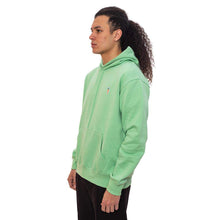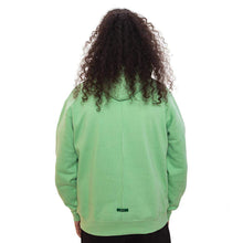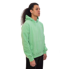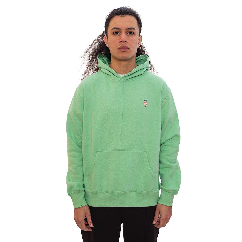 Sage green hoodie with carrots logo on chest and exterior carrots back tab.