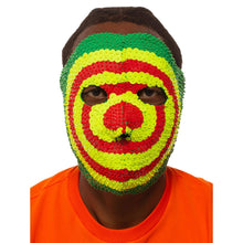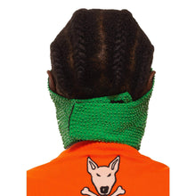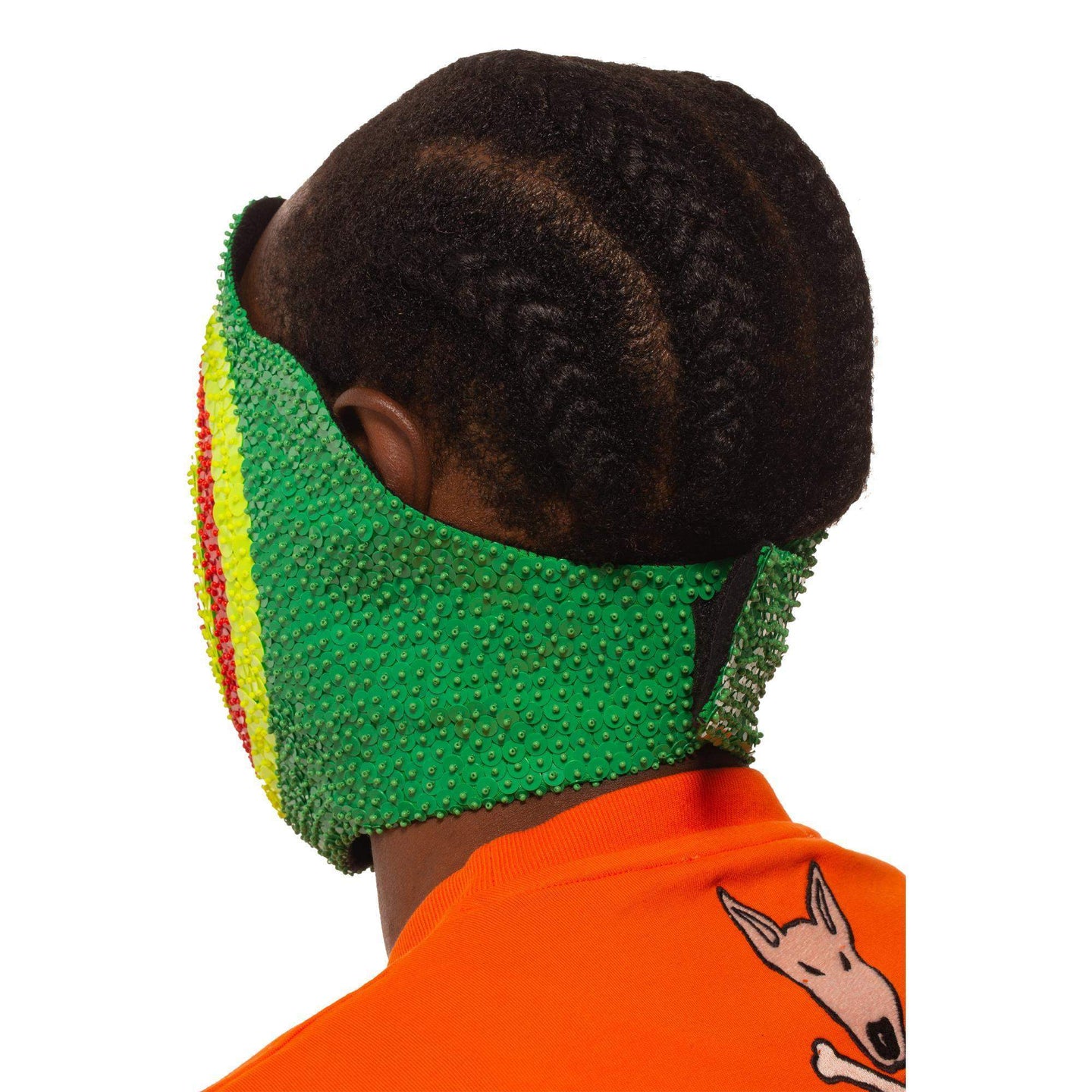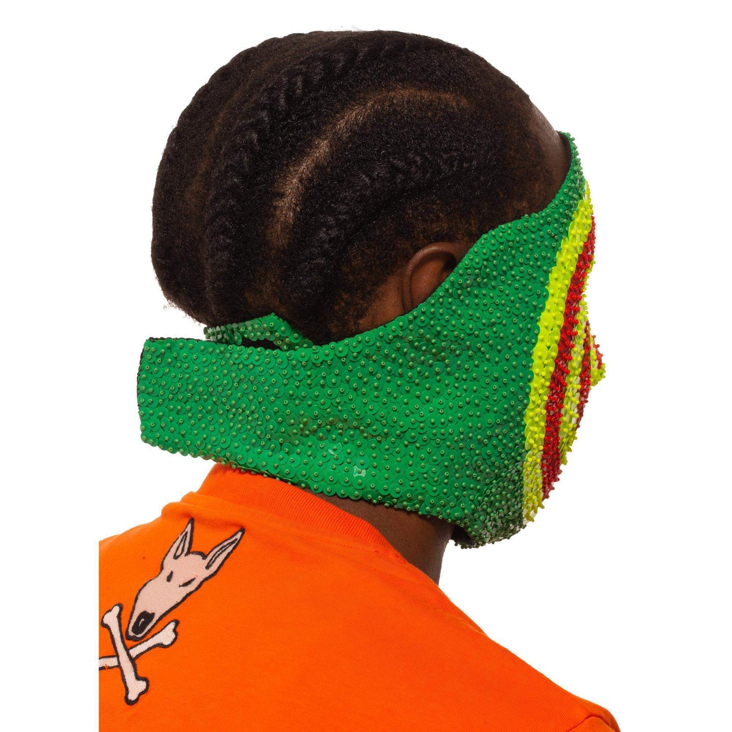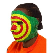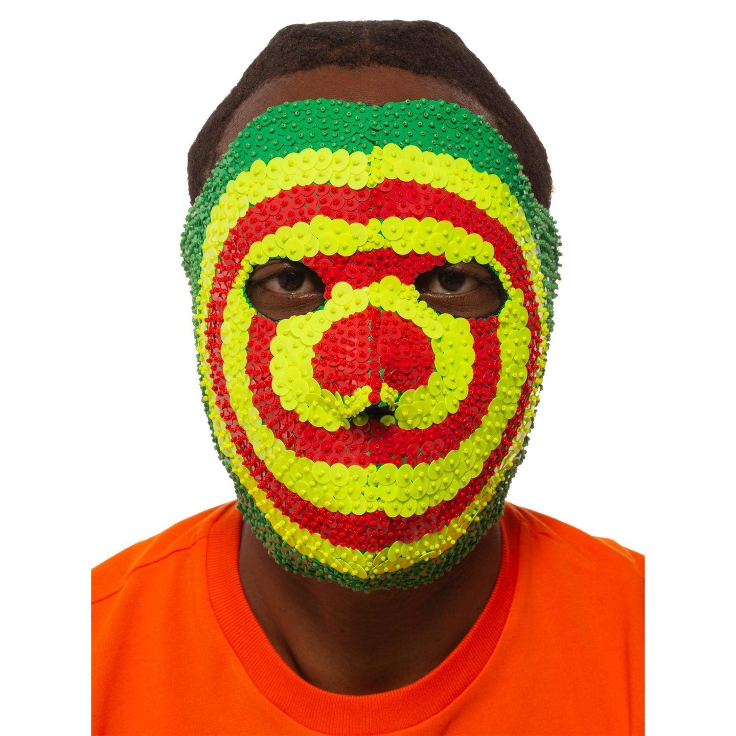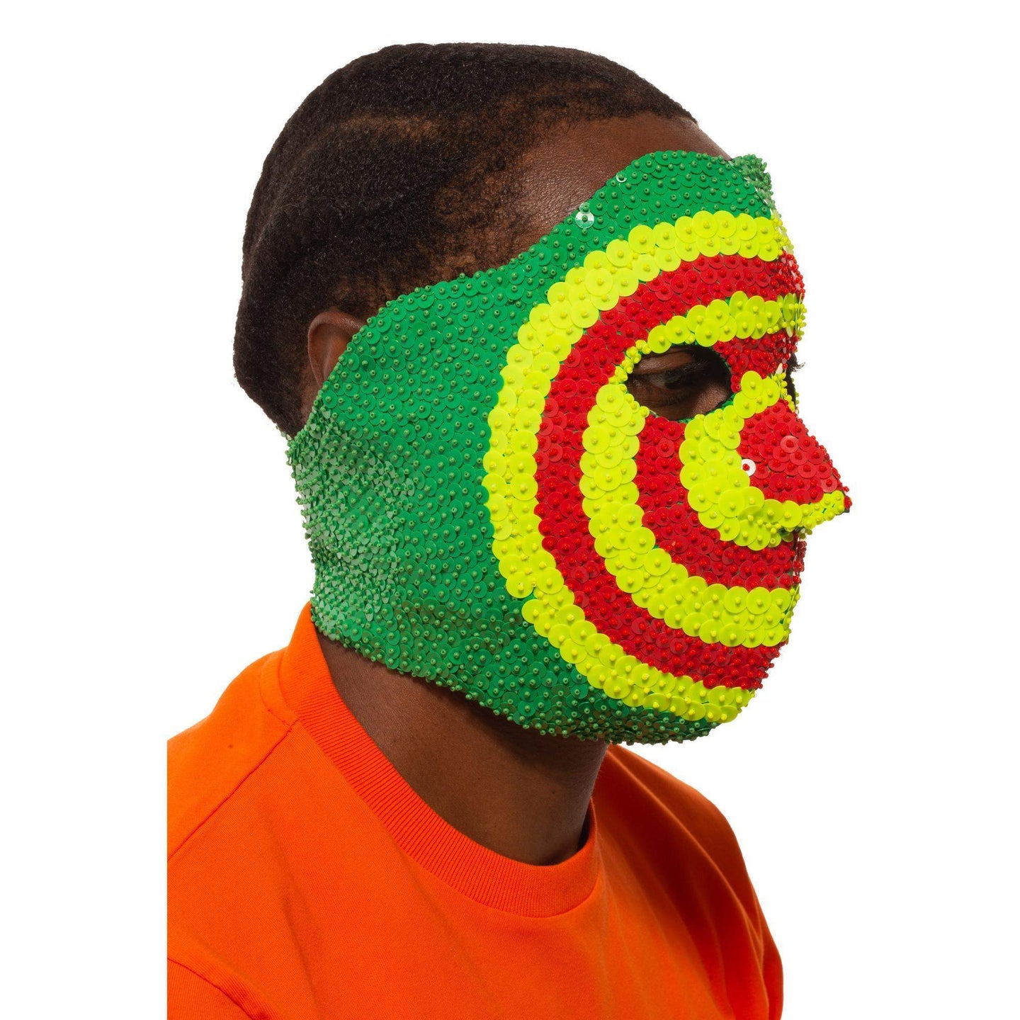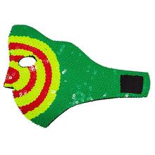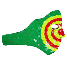 Sequin covered green mask with yellow and red target design. Velcro strap enclosure on the back.