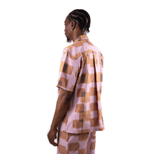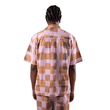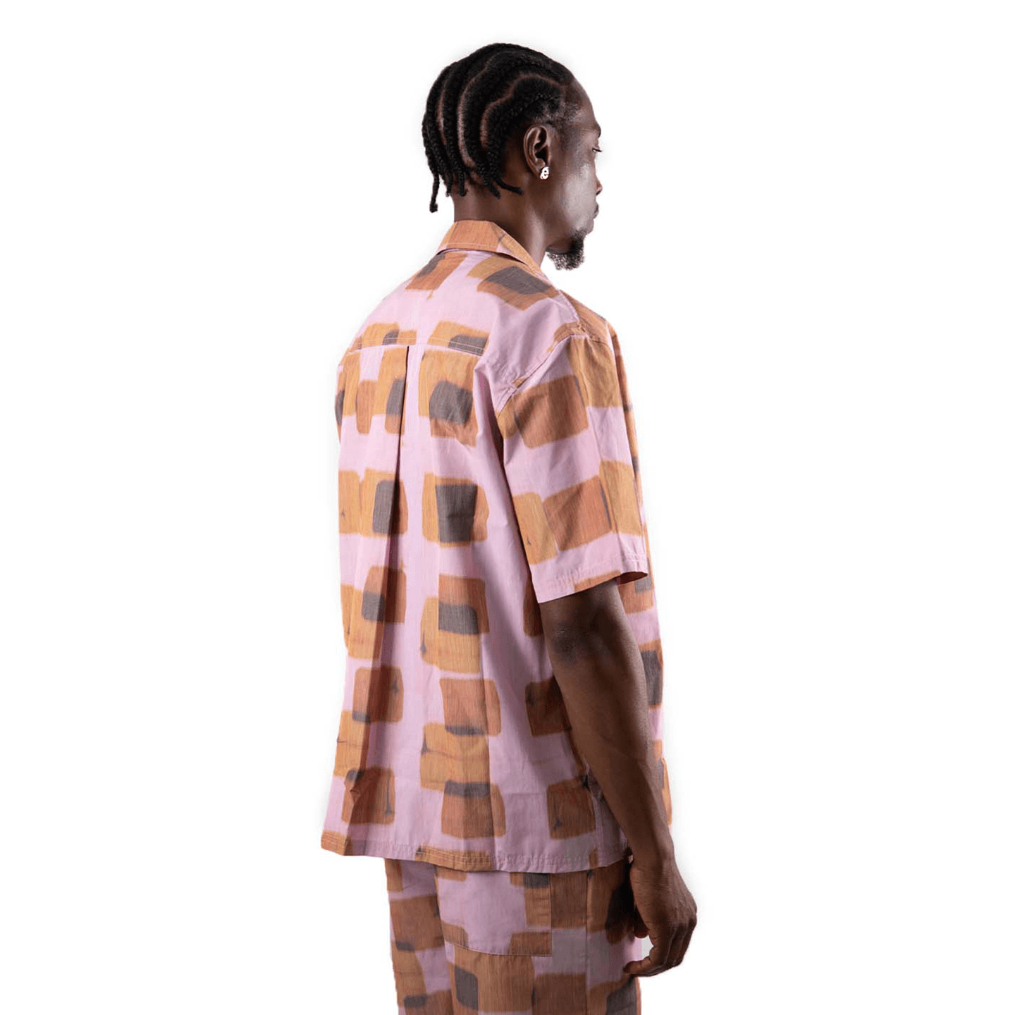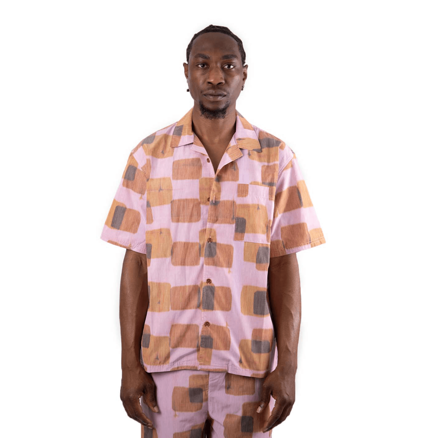 All over print of Orange and brown cube pattern on pink relaxed fit short sleeve button up collared shirt.