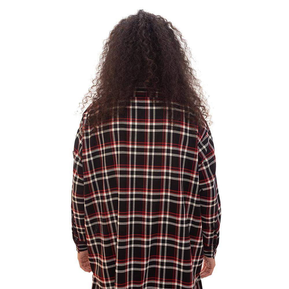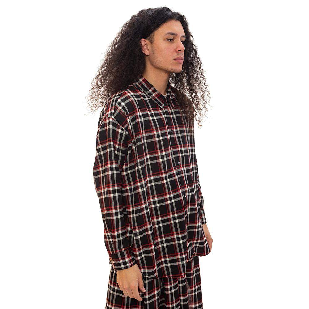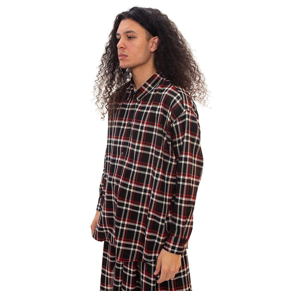 A popular classic that has been deployed for several seasons, a drop shoulder big shirt. Regular color with no collar, single cuffs. Over silhouette that creates plenty of drapes. Uses the check pattern provided by UNDERCOVER's archive to produce the original. The "REBEL FABRIC" tag placed on the left hem is specially designed by UNDERCOVER designer Jun Takahashi for N.HOOLYWOOD.