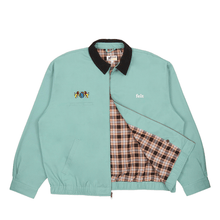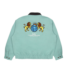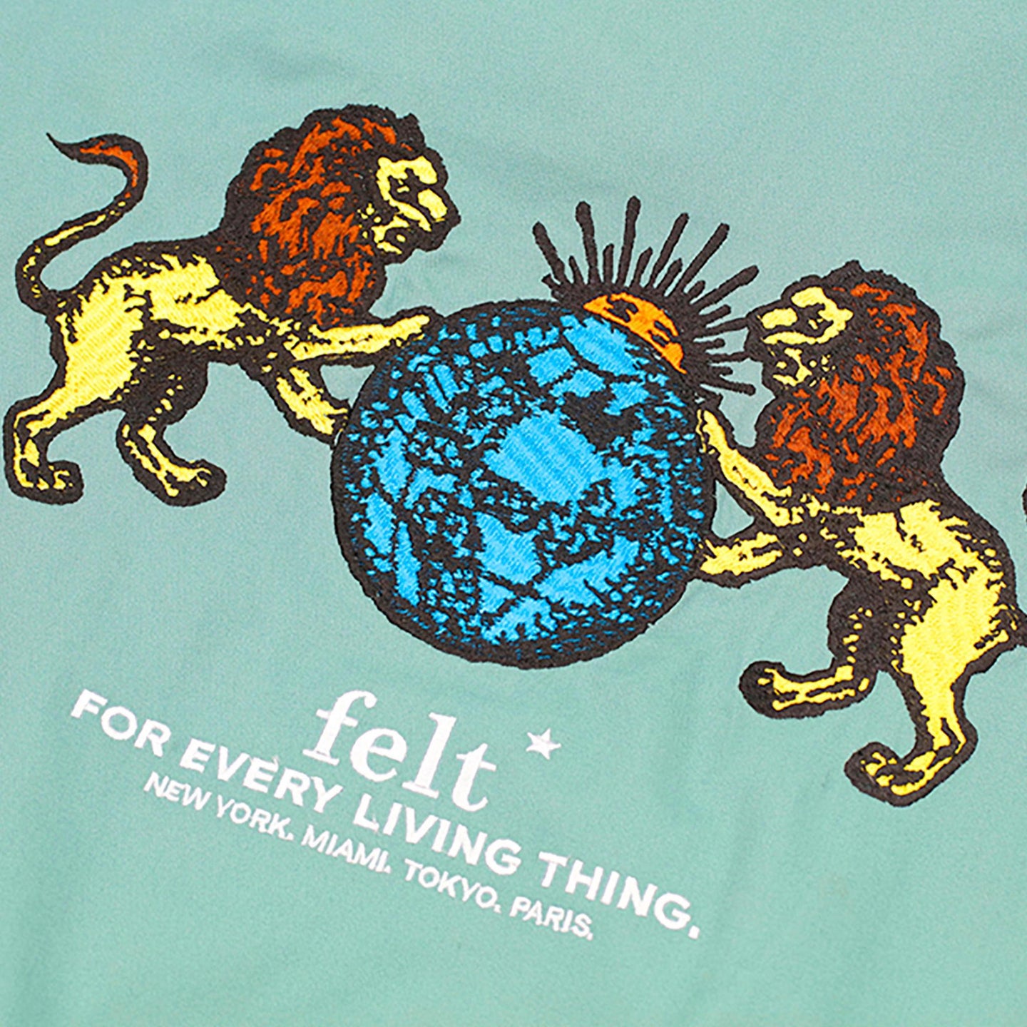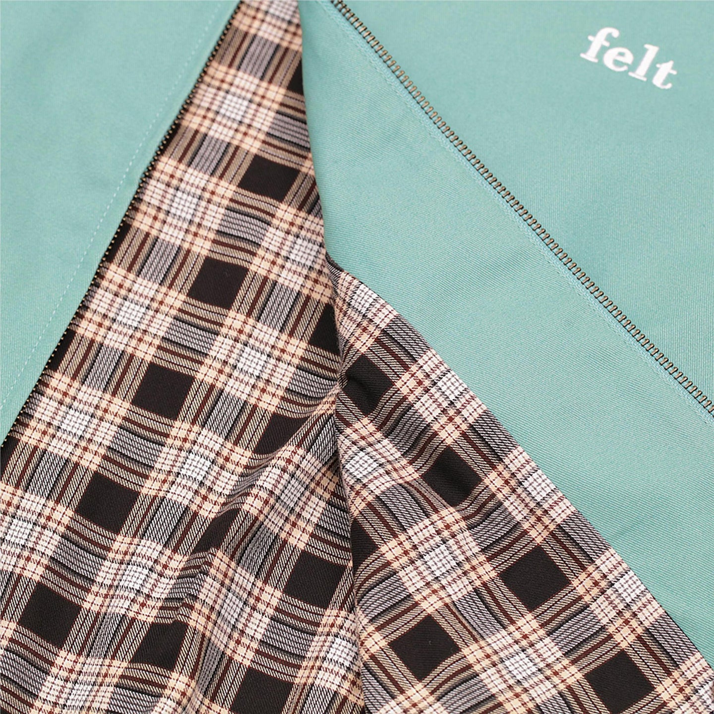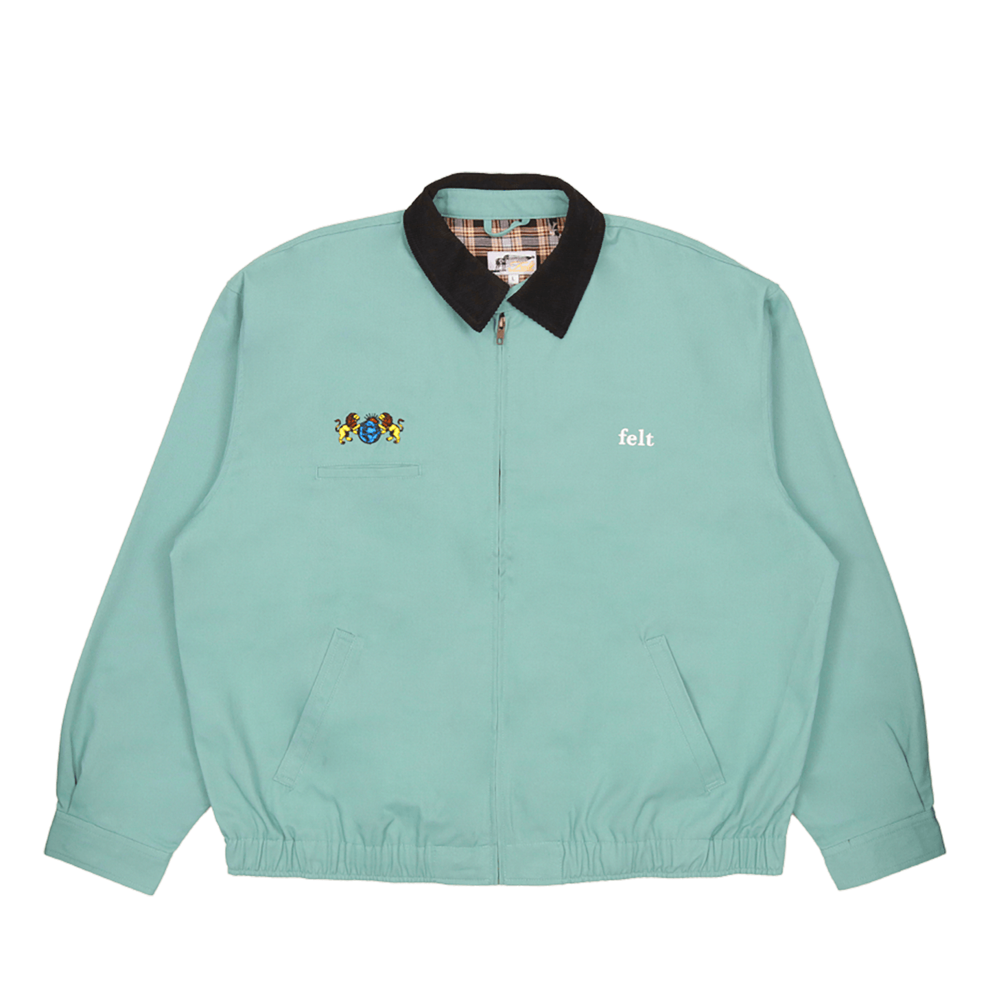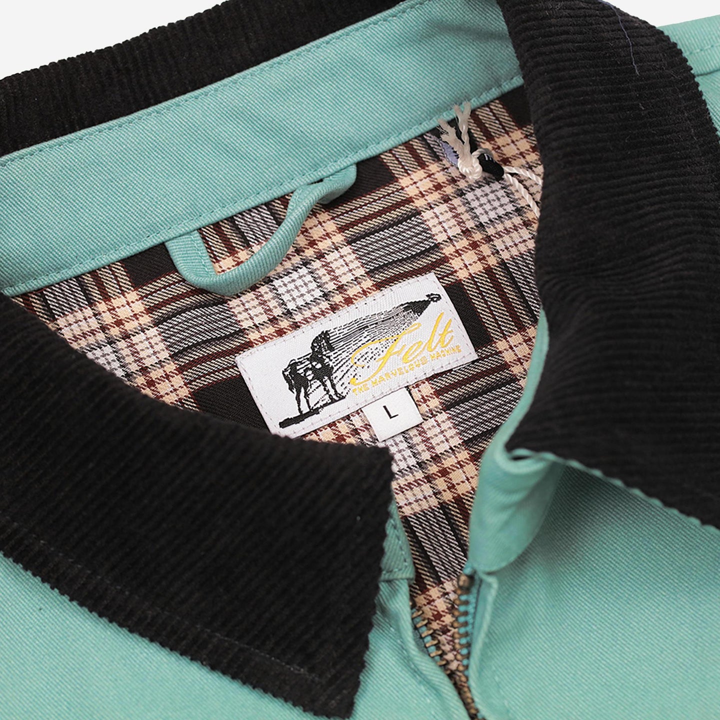 FELT "For Every Living Thing" teal heavy weight cotton twill jacket wit cordiroy collar and plaid cotton flannel lining. Front welt pockets. Adjustable sleeve cuffs. Embroidered "union" logo at right chest and back. "FELT" logo embroidery at left chest.