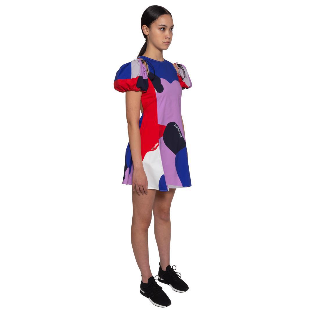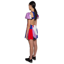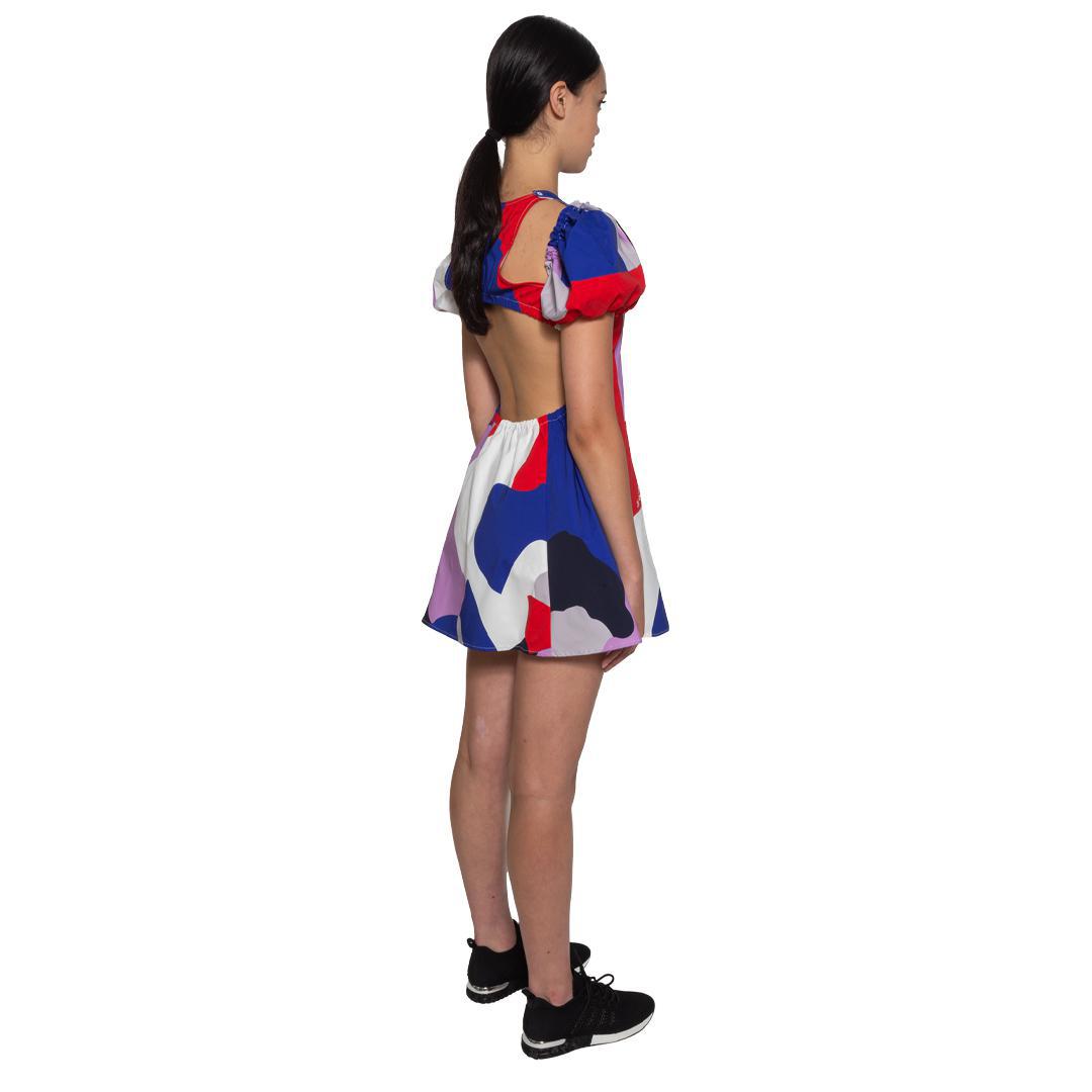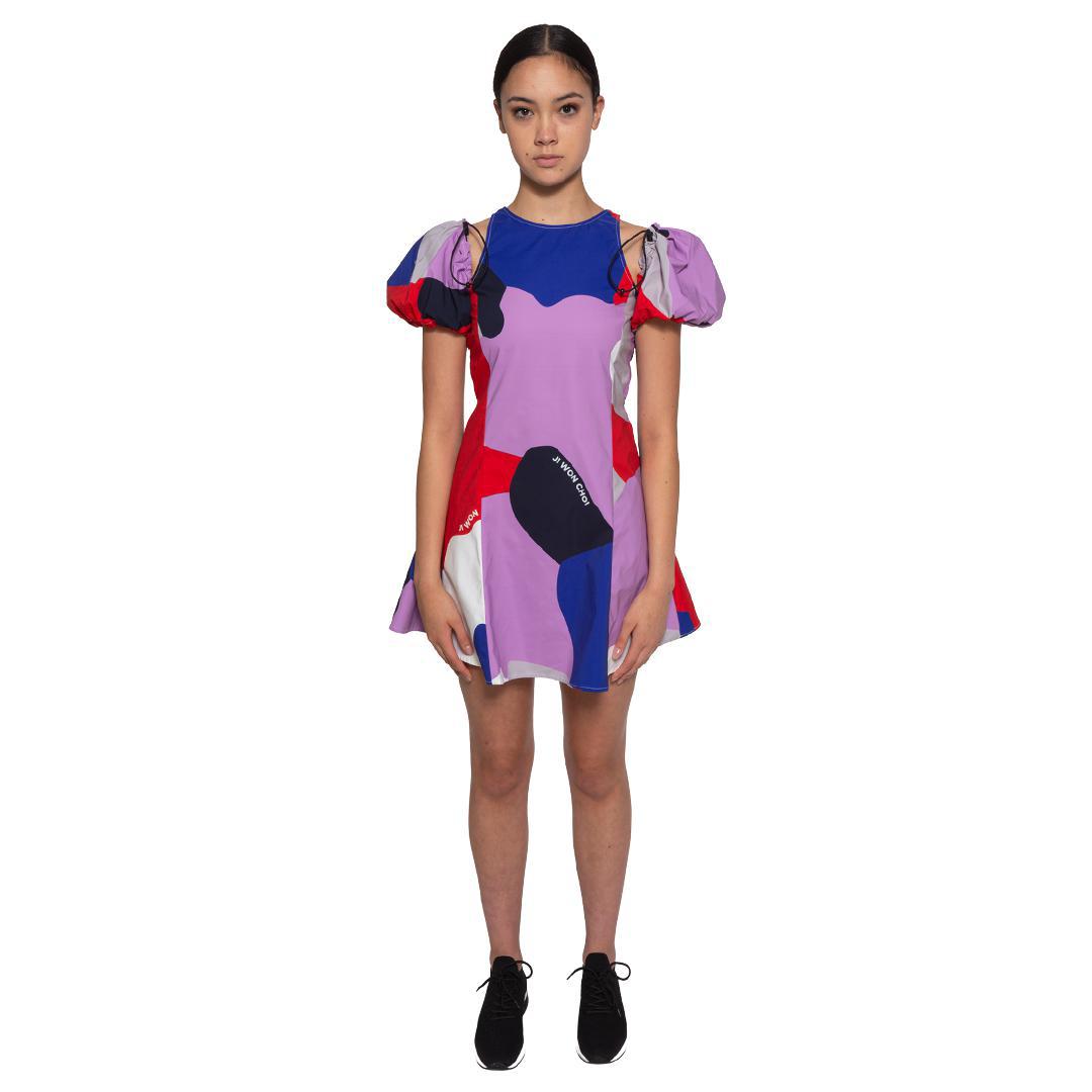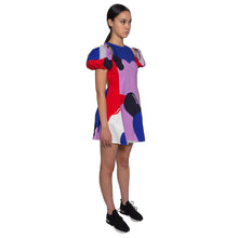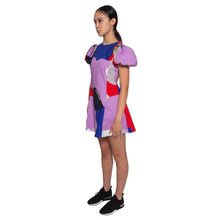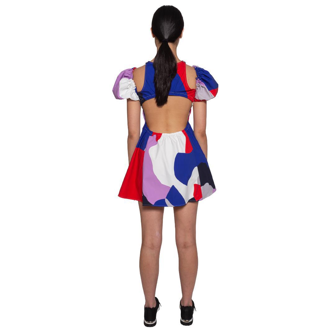 Mid-thigh flare dress with elastic puff sleeves that can be worn on the shoulders or down. Elastic at high waist, with cutout in the back.