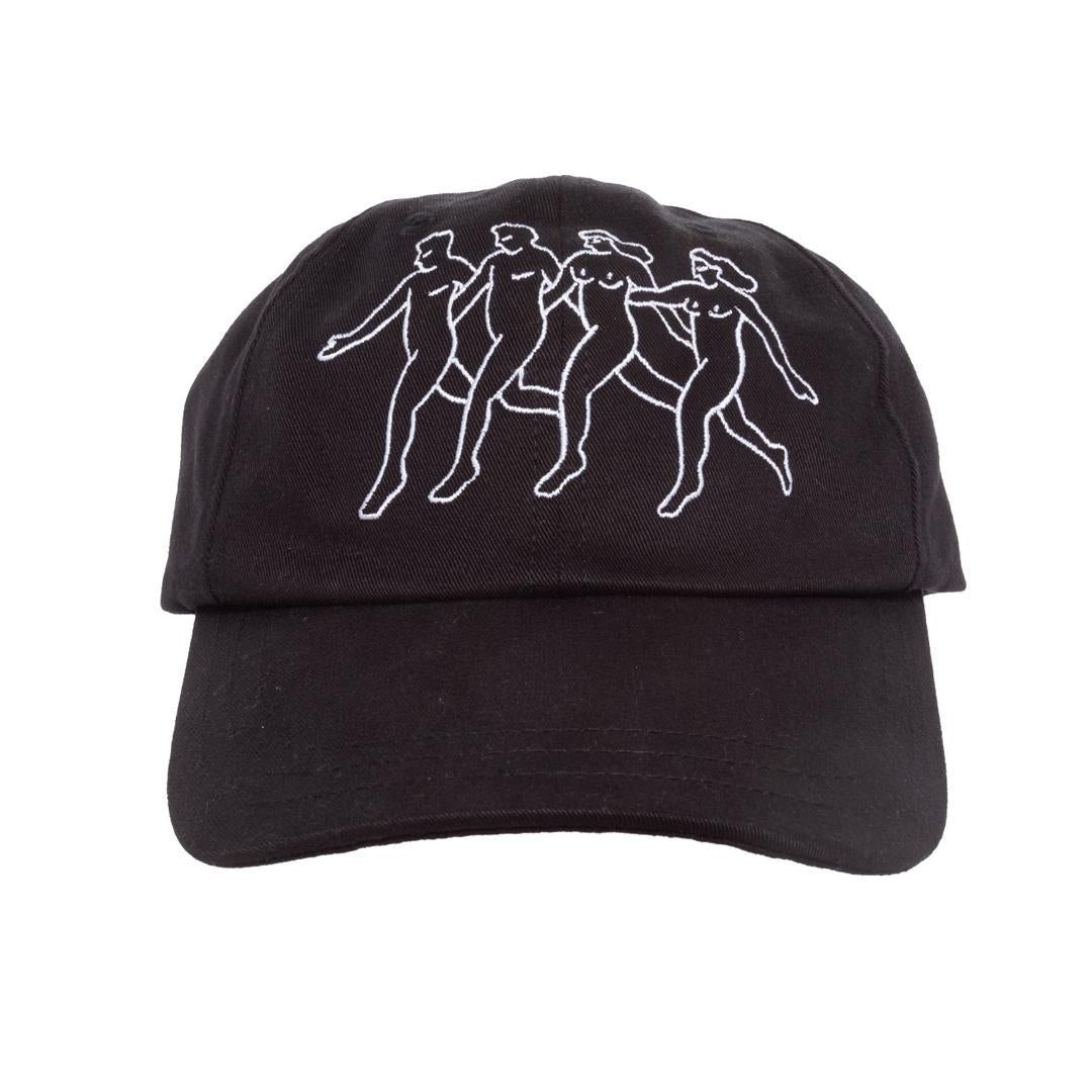 From Carne Bollente Spring/Summer 22. Adjustable buckle-back baseball cap with large embroidered graphic of dancing nude figures across front.